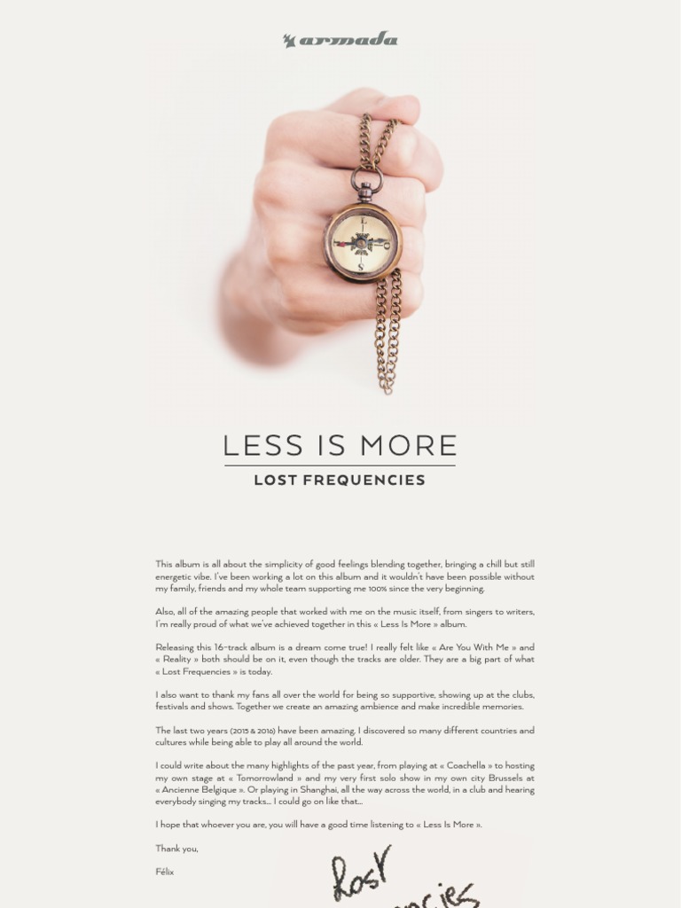 Album Review Lost Frequencies Less Is More We Rave You from weraveyou.com Anywhere you are and you'll go, i follow mountain high and river low, i follow take me to the bottom, drive me in low wherever you go Anywhere you are and you'll go, i follow mountain high and river low, i follow take me to the bottom. Video clip and lyrics beautiful life by lost frequencies. Find who are the producer and director of this music video. Less is more (2016) all or nothing.