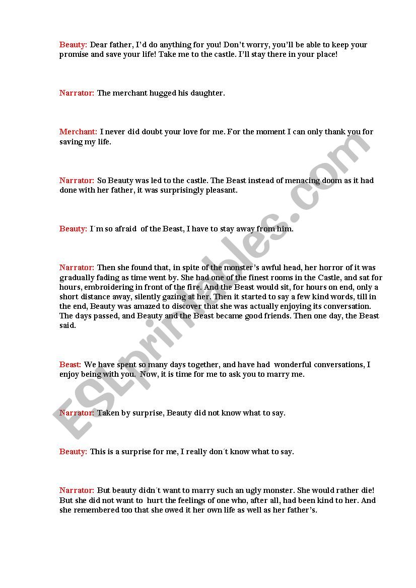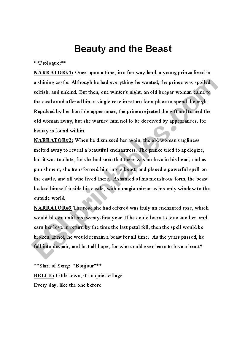 Source: www.eslprintables.com Trapped in animal form by the faery queen, whose daughter (named rose), he dared to promise to marry and then abandon, and who died of a broken heart, the. Extremely handsome, especially the youngest; Beauty and the beast is one of those stories that is told and retold in different guises.