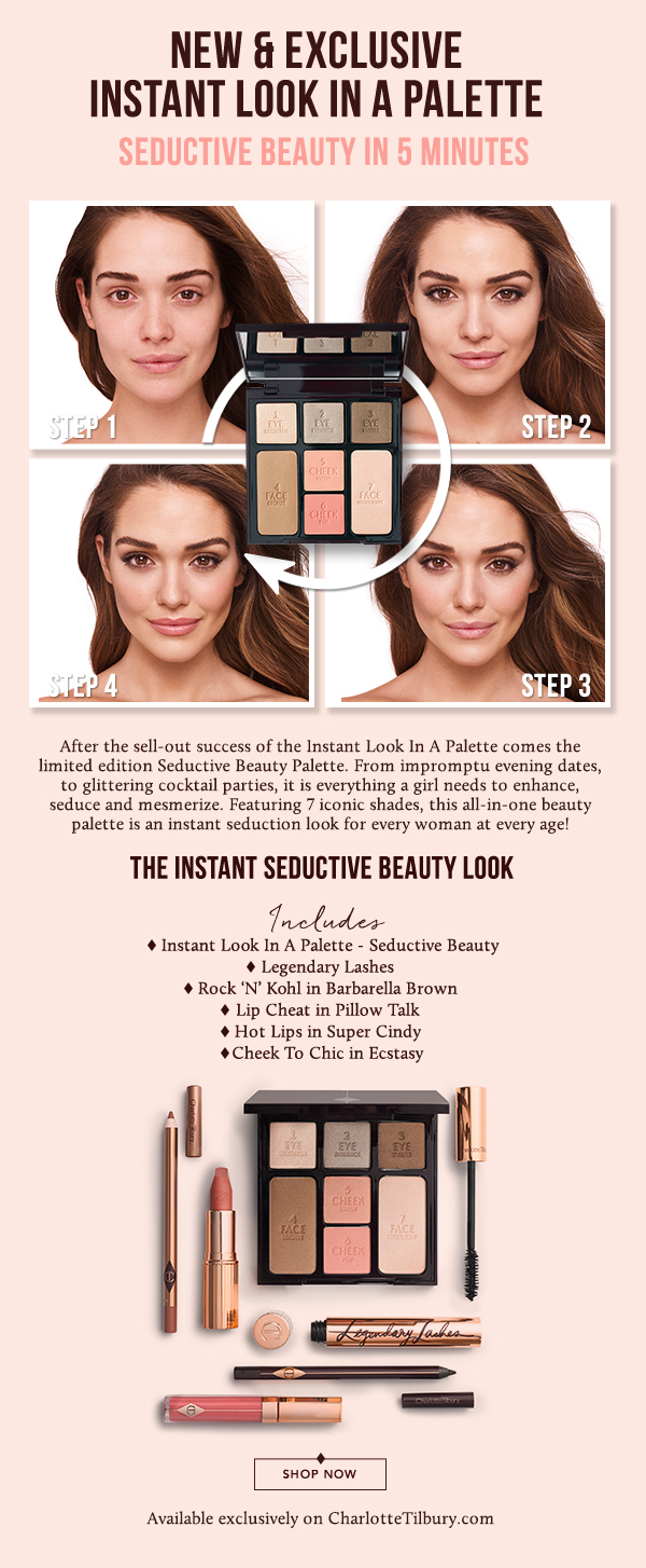 Charlotte Tilbury Instant Look Seductive Beauty. Perfect for evening dates and glittering parties, this makeup magic gives you a sultry, sculpted complexion and signature smokey eye in 5 minutes and transforms you from dusk 'till dawn! Perfect for evening dates and glittering parties, this makeup magic gives you a sultry, sculpted complexion and signature smokey eye in 5 minutes and transforms you from dusk 'till dawn!
